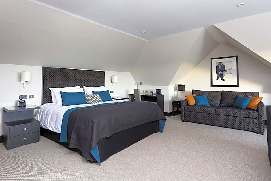 The Chester Suite features a spacious bedroom complete with a TV that rises from the foot of the bed, and a separate living area with a bar. The private bathroom comes with a freestanding bath and rainfall shower.